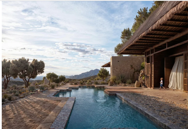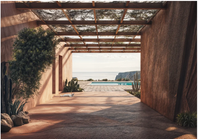Σκιερές αυλές και βεράντες, καλυμμένες με κομψές ξύλινες πέργκολες που φέρουν υφασμάτινες επιστρώσεις, παρέχουν καταφύγιο από τον ήλιο και παράλληλα προσκαλούν τους κατοίκους να απολαύσουν την ανεπιτήδευτη ομορφιά του νησιού. Αυτοί οι χώροι αντικατοπτρίζουν το φιλόξενο πνεύμα της Κρήτης, συνδυάζοντας άνεση και αυθεντικότητα», εξηγεί η ομάδα του αρχιτεκτονικού γραφείου VΑstudio.