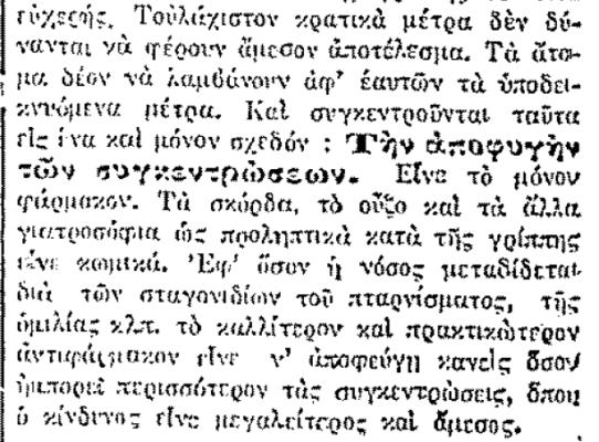 Το ίδιο συνέβη και στη Θεσσαλονίκη, ενώ ακολούθησαν σχεδόν όλες οι μεγάλες πόλεις της Ελλάδας. Διαβάστε ακόμα: Δεν ήταν έμπολα ο λοιμός που αφάνισε την Αθήνα του Περικλή, απαντούν στους ξένους ερευνητές, οι Έλληνες επιστήμονες. Η έρευνα σε ομαδικό τάφο στον Κεραμεικό δείχνει τυφοειδή πυρετό Καθώς η γρίπη συνέχισε να εξαπλώνεται ταχύτατα, το «λουκέτο» δε διήρκεσε 15 μέρες.