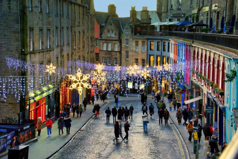 Η Σκωτία ξέρει πώς να διοργανώνει ένα γιορτινό πάρτι. Με έξι εβδομάδες εορτασμών από την Ημέρα του Αγίου Ανδρέα μέχρι το Hogmanay (Πρωτοχρονιά), το Εδιμβούργο ξεχειλίζει από εποχιακό ενθουσιασμό. Κάντε μια βόλτα στη χριστουγεννιάτικη αγορά στο δραματικό της σκηνικό κάτω από το Κάστρο του Εδιμβούργου. Δείτε από ψηλά τον εορταστικό διάκοσμο και την καρναβαλική ατμόσφαιρα στη μεγάλη ρόδα αυτής της χριστουγεννιάτικης πόλης ή απολαύστε τους πολλούς όμορφα φωτισμένους δρόμους και τα καταστήματα στο κέντρο της πόλης.