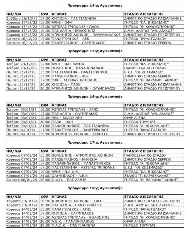 ΑΘΛΗΤΙΚΑ Super League: Από τη 14η αγωνιστική συνεχίζεται το πρωτάθλημα 12 Δεκεμβρίου 2023 20:41 SUPERLEAGUE 2023-2024 / ΠΑΟΚ - ΑΣΤΕΡΑΣ ΤΡΙΠΟΛΗΣ (ΒΑΣΙΛΗΣ ΒΕΡΒΕΡΙΔΗΣ/ ΜΟΤΙΟΝ ΤΕΑΜ) Μοιραστείτε αυτό! Facebook Twitter Google Plus Pinterest LinkedIn Από την 14η αγωνιστική θα συνεχιστεί το πρωτάθλημα της Super League. Από την αγωνιστική δηλαδή που αναβλήθηκε λόγω της αποχής των διαιτητών. Το Δ.Σ. της Λίγκας γνωστοποίησε το πρόγραμμα των αγώνων έως τη 18η αγωνιστική. μπορεί να σου αρέσει επίσης ΚΡΗΤΗ Κρήτη: Χειροπέδες σε 35χρονο Ρουμάνο για ασέλεγεια σε βάρος ανήλικης 15 Δεκεμβρίου 2025 ΑΓΡΟΤΙΚΑ • ΚΡΗΤΗ Κρήτη – ΟΠΕΚΕΠΕ: Συνέχιζαν τις ψευδείς δηλώσεις και φέτος, μετά τις αποκαλύψεις – Εγκέφαλος του κυκλώματος ένας 47χρονος αγροτοσυνδικαλιστής 15 Δεκεμβρίου 2025 Δήμος Πλατανιά • Νομός Χανίων Χριστούγεννα στον Πλατανιά: Φωταγωγήσεις και δράσεις σε χωριά του Δήμου 15 Δεκεμβρίου 2025 Κουλιεράκης: «Υπάρχει εξαιρετικό κλίμα στον ΠΑΟΚ» ΟΦΗ: Σε καλό δρόμο οι εξελίξεις για την κατασκευή νέου σύγχρονου γηπέδου Μοιραστείτε αυτό! Facebook Twitter Google Plus Pinterest LinkedIn ΡΟΗ ΕΙΔΗΣΕΩΝ ΚΡΗΤΗ Κρήτη: Χειροπέδες σε 35χρονο Ρουμάνο για ασέλεγεια σε βάρος ανήλικης 15 Δεκεμβρίου 2025 13:26 ΑΓΡΟΤΙΚΑ • ΚΡΗΤΗ Κρήτη – ΟΠΕΚΕΠΕ: Συνέχιζαν τις ψευδείς δηλώσεις και φέτος, μετά τις αποκαλύψεις – Εγκέφαλος του κυκλώματος ένας 47χρονος αγροτοσυνδικαλιστής 15 Δεκεμβρίου 2025 13:17 Δήμος Πλατανιά • Νομός Χανίων Χριστούγεννα στον Πλατανιά: Φωταγωγήσεις και δράσεις σε χωριά του Δήμου 15 Δεκεμβρίου 2025 13:05 ΕΛΛΑΔΑ Απεργία ΑΔΕΔΥ: 24ωρη πανελλαδική πανδημοσιοϋπαλληλική απεργία αύριο, Τρίτη 16/12 – Ποιοι βγαίνουν στους δρόμους 15 Δεκεμβρίου 2025 12:47 Νομός Χανίων Χανιά: Συγκεντρώθηκαν 6.750 ευρώ σε φιλανθρωπική εκδήλωση για τη Μονάδα Νεογνών του Νοσοκομείου 15 Δεκεμβρίου 2025 12:35 ΑΓΡΟΤΙΚΑ • ΕΛΛΑΔΑ • ΚΡΗΤΗ Παράταση έως το 2026 στην εφαρμογή του Ψηφιακού Δελτίου Αποστολής για τη διακίνηση ελαιοκάρπου 15 Δεκεμβρίου 2025 12:27 ΕΛΛΑΔΑ • ΕΝΔΙΑΦΕΡΟΝΤΑ Xριστούγεννα με ασφάλεια! Τι πρέπει να προσέξουν οι γονείς αυτές τις γιορτινές μέρες 15 Δεκεμβρίου 2025 12:15 Γεύση - Ψυχαγωγία Γη της ελιάς: Ο Κουράκος με τη Μαρουσώ βάζουν το σχέδιό τους σε εφαρμογή με σκοπό να παγιδέψουν τον serial killer 15 Δεκεμβρίου 2025 12:09 ΚΡΗΤΗ Κρήτη: Στο νοσοκομείο ανήλικη έπειτα από κατανάλωση αλκοόλ – Συνελήφθη ο υπεύθυνος του καταστήματος 15 Δεκεμβρίου 2025 12:02 Νομός Χανίων Χανιά: Με αμείωτο ρυθμό συνεχίζονται οι έρευνες για τον 33χρονο γιατρό που εξαφανίστηκε – Έκκληση από την οικογένειά του 15 Δεκεμβρίου 2025 11:47 ΑΘΛΗΤΙΚΑ • Νομός Χανίων Στο τεχνικό επιτελείο της Εθνικής Ισραήλ ο προπονητής γυναικών του ΝΟΧ, Σεμπάστιαν Λειψάκης 15 Δεκεμβρίου 2025 11:34 ΕΛΛΑΔΑ • ΟΙΚΟΝΟΜΙΑ Τι ισχύει με το νέο κληρονομικό δίκαιο – Οι αλλαγές 15 Δεκεμβρίου 2025 11:25 ΚΡΗΤΗ • Νομός Χανίων BOAK: Mε τη νέα χρονιά ξεκινούν και τα έργα στο τμήμα Χανιά – Ηράκλειο 15 Δεκεμβρίου 2025 11:17 Δήμος Κισάμου • ΝΕΟΙ ΟΡΙΖΟΝΤΕΣ Kίσαμος: Πρόταση για ίδρυση Ανώνυμης Εταιρίας φορέων, με αντικείμενο τη διαχείριση του Φεστιβάλ Γεύσεων και Χριστουγεννιάτικες – Αποκριάτικες εκδηλώσεις 15 Δεκεμβρίου 2025 11:12 ΟΙΚΟΝΟΜΙΑ Πληρωμές Δεκεμβρίου: Ποιοι είναι οι δικαιούχοι που θα δουν χρήματα στους λογαριασμούς τους – Έως το τέλος του μήνα οι πληρωμές 15 Δεκεμβρίου 2025 10:59 Δημοφιλή αυτή την εβδομάδα