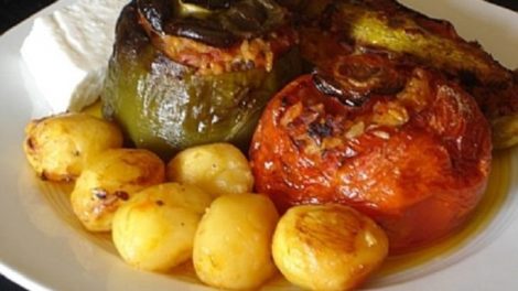 Υλικά 4 μεγάλες ντομάτες 4 μεγάλες πιπεριές (πράσινες ή κόκκινες) 2 κολοκυθάκια, τριμμένα 2 μελιτζάνες, τριμμένες 2 πατάτες, κομμένες σε φέτες (για το ταψί) 1 μεγάλο...