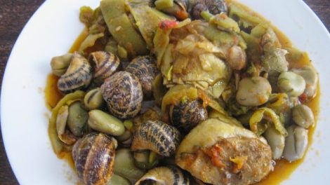 Υλικά: Μισό κιλό χοχλιοί, 4 μέτριες πατάτες, 4 – 6 αγκινάρες, 2 – 3 ντομάτες, 2 ξερά κρεμμυδάκια, άνηθο και μαϊντανό, ελαιόλαδο, αλάτι και πιπέρι (αν...