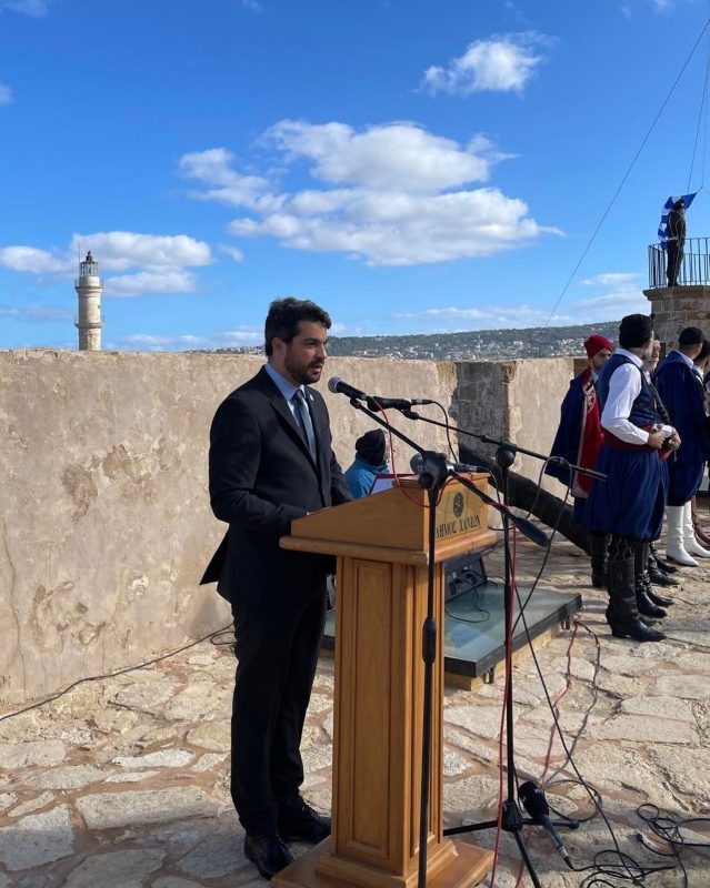 Εκεί παρευρέθηκε και ο Δήμαρχος Χανίων, Παναγιώτης Σημανδηράκης, ο οποίος εκφώνησε τον πανηγυρικό της ημέρας για τη μεγάλη επέτειο για ολόκληρη την Κρήτη.