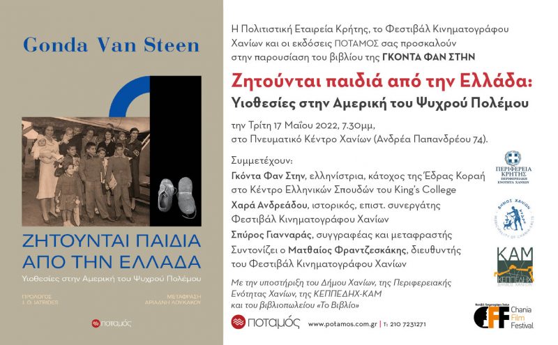 Η Πολιτιστική Εταιρεία Κρήτης, το Φεστιβάλ Κινηματογράφου Χανίων και οι εκδόσεις ΠΟΤΑΜΟΣ σας προσκαλούν στην παρουσίαση του βιβλίου της ΓΚΟΝΤΑ ΦΑΝ ΣΤΗΝ, “Ζητούνται παιδιά από την Ελλάδα – Υιοθεσίες στην Αμερική του Ψυχρού Πολέμου”