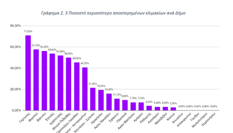 Ο Δήμος Κισάμου βρίσκεται στην 17η θέση του γραφήματος που αποτυπώνει την αποστέρηση στους Δήμους Κρήτης, με ποσοστό μόλις 3,40%, ενώ χαμηλότερα ποσοστά εμφανίζει ο Δήμος Χανίων (2,90%) και μηδενικά οι Δήμοι Αποκορώνου και Γαύδου.