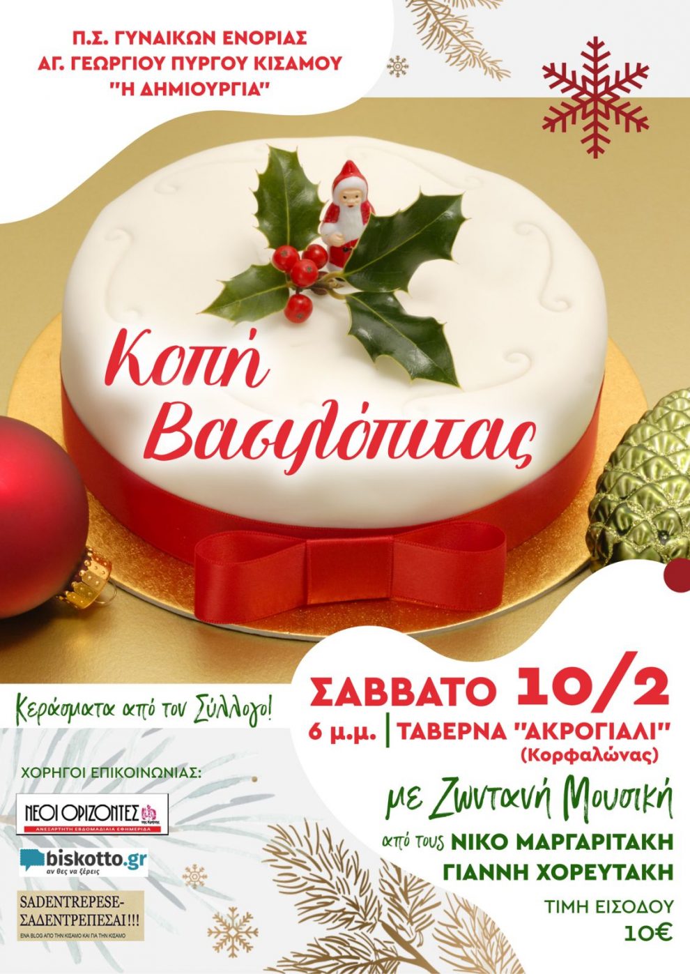 Το Σάββατο 10 Φεβρουαρίου και ώρα 6 μ.μ., στη Ταβέρνα “Ακρογιάλι” στον Κορφαλώνα Κισάμου θα κόψει την πίτα του ο Σύλλογος Γυναικών Ενορίας Πύργου Καστελλίου “Η Δημιουργία”.