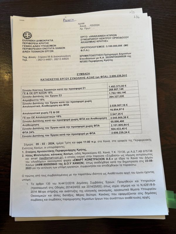 Παρουσία του Περιφερειάρχη Κρήτης κ. Σταύρου Αρναουτάκη, του Σεβ. Μητροπολίτου Κισάμου & Σελίνου κ. Αμφιλοχίου, του Αντιπεριφερειάρχη Χανίων κ. Νίκου Καλογερή, του Γενικού Διευθυντή της Ορθοδόξου Ακαδημίας Κρήτης Δρ. Κωνσταντίνου Ζορμπά, των Προϊσταμένων των Τεχνικών Υπηρεσιών και Μηχανικών της Αντιπεριφέρειας Χανίων, των Μηχανικών της Ιεράς Μητροπόλεως Κισάμου & Σελίνου, ως και των εκπροσώπων της αναδόχου κατασκευαστικής εταιρείας Smart Constructions, πραγματοποιήθηκε, στα γραφεία της Αντιπεριφέρειας Χανίων, η υπογραφή σύμβασης που αφορά το έργο «Ανακαίνιση Κτιρίων Συνεδριακού Κέντρου Ορθοδόξου Ακαδημίας Κρήτης», προϋπολογισμού 3.100.000 ευρώ, έργο χρηματοδοτούμενο από το Πρόγραμμα Δημοσίων Επενδύσεων της Περιφέρειας Κρήτης.
