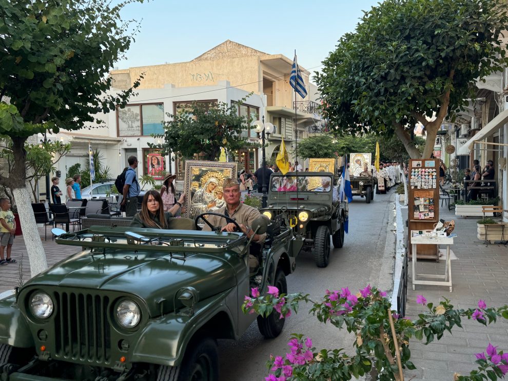 Προ της αναχωρήσεως των ιερών Εικόνων εκ του Ι. Καθεδρικού Ναού Αγίου Σπυρίδωνος, ο Σεβ. Ποιμενάρχης κ. Αμφιλόχιος τέλεσε Ιερά Παράκληση και την ευλογία των καρπών της γης. Κατά την διάρκεια δε της ιεράς λιτανείας ανέπεμψε δεήσεις και ευχές στον «Κύριο Παντοκράτορα» «…του βρέξαι και όμβρον δούναι καρποφόρον ημίν…». Μουσική Στρατιωτική Μπάντα και ένοπλο Τιμητικό Στρατιωτικό Άγημα απέδιδαν τιμές. Ο Σύλλογος διατήρησης ιστορικών οχημάτων Κρήτης, ευγενώς προσφερόμενος, μετέφερε με ιδιόκτητα αυτοκίνητα τις Ιερές Εικόνες.