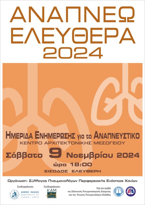 Ο Σύλλογος Πνευμονολόγων της Περιφερειακής Ενότητας Χανίων, σε συνδιοργάνωση με τον Δήμο Χανίων και υπό την αιγίδα της Ελληνικής Πνευμονολογικής Εταιρείας (ΕΠΕ) και της Ένωσης Πνευμονολόγων Ελλάδας (ΕΠΝΕΛ), έχει την τιμή να ανακοινώσει την ετήσια ημερίδα «Αναπνέω Ελεύθερα 2024». Η εκδήλωση θα πραγματοποιηθεί το Σάββατο 9 Νοεμβρίου 2024 στις 18:00, στο Κέντρο Αρχιτεκτονικής της Μεσογείου (ΚΑΜ), στα Χανιά.