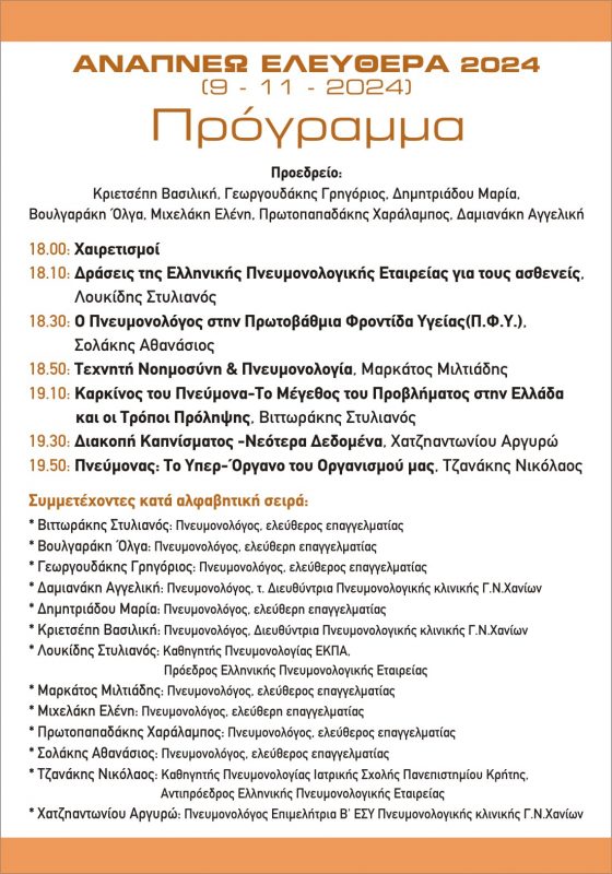Σας προσκαλούμε να παρευρεθείτε και να συμμετάσχετε ενεργά στην ημερίδα «Αναπνέω Ελεύθερα 2024», συνεισφέροντας στην κοινή προσπάθεια για έναν πιο υγιή και ενημερωμένο πληθυσμό.