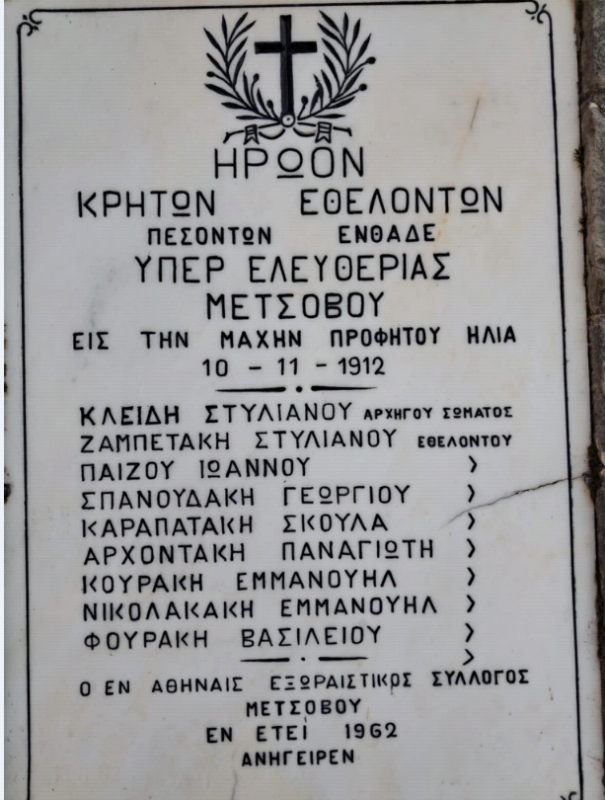 Το μεσημέρι του Σαββάτου 2 Νοεμβρίου επισκεφθήκαμε τον λόφο του Προφήτη Ηλία όπου σε μια στήλη αναφέρονται τα ονόματα 9 Κρητών νεκρών στη μάχη του Μετσόβου. Τρισάγιο, ρίγη συγκίνησης από μία Μετσοβίτισσα που ερμήνευσε το μοιρολόι των γυναικών Μετσόβου προς τους νεκρούς ελευθερωτές. Παρόμοια συγκίνηση και από τον Πρόεδρο του Συλλόγου Βρακοφόρων Δυτικής Κρήτης Χαράλαμπο Σιδεράκη που ερμήνευσε το ακόλουθο ριζίτικο, παραγγελιά του τραυματία στρατιώτη προς τη μάνα του.