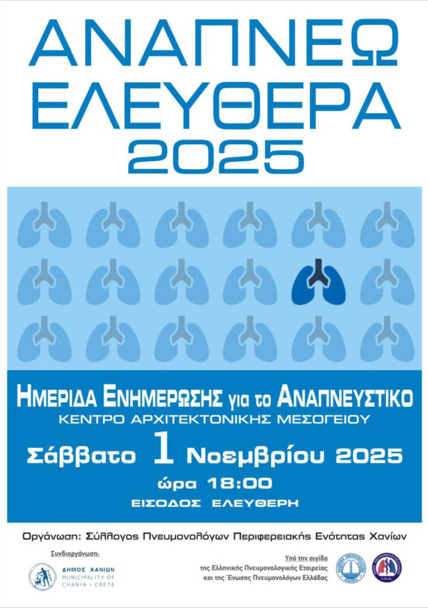 Ο Σύλλογος Πνευμονολόγων Περιφερειακής Ενότητας Χανίων διοργανώνει για μία ακόμη χρονιά την ετήσια ενημερωτική εκδήλωση «Αναπνέω Ελεύθερα 2025», με στόχο την ευαισθητοποίηση και ενημέρωση του κοινού σε κρίσιμα ζητήματα αναπνευστικής υγείας.