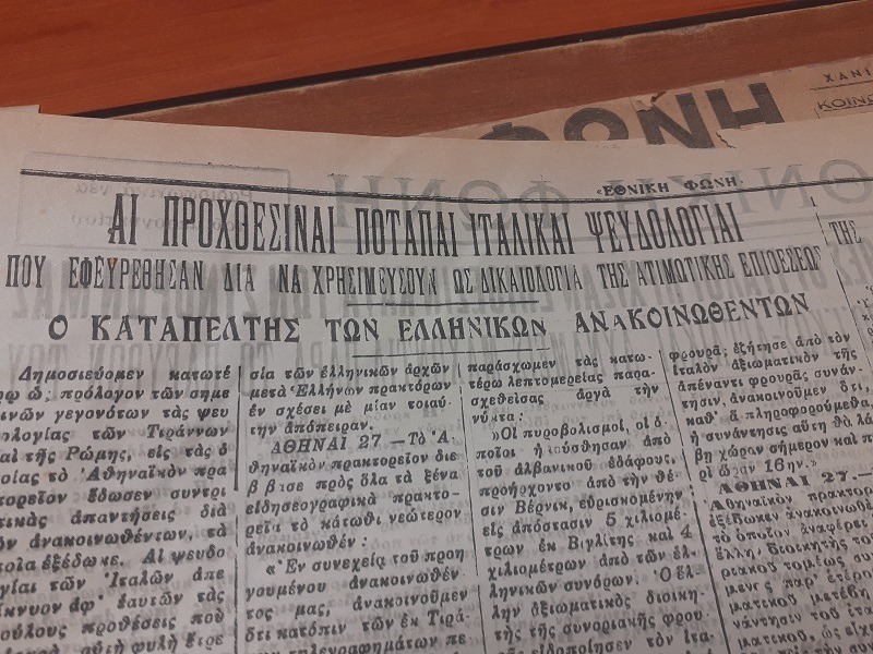 Το πολύτιμο αυτό υλικό φυλάσσεται στο Ιστορικό Αρχείο Κρήτης από όπου το ΑΠΕ – ΜΠΕ βρήκε στοιχεία από τα δημοσιεύματα για τις πρώτες ώρες της κήρυξης του πολέμου στα Χανιά.