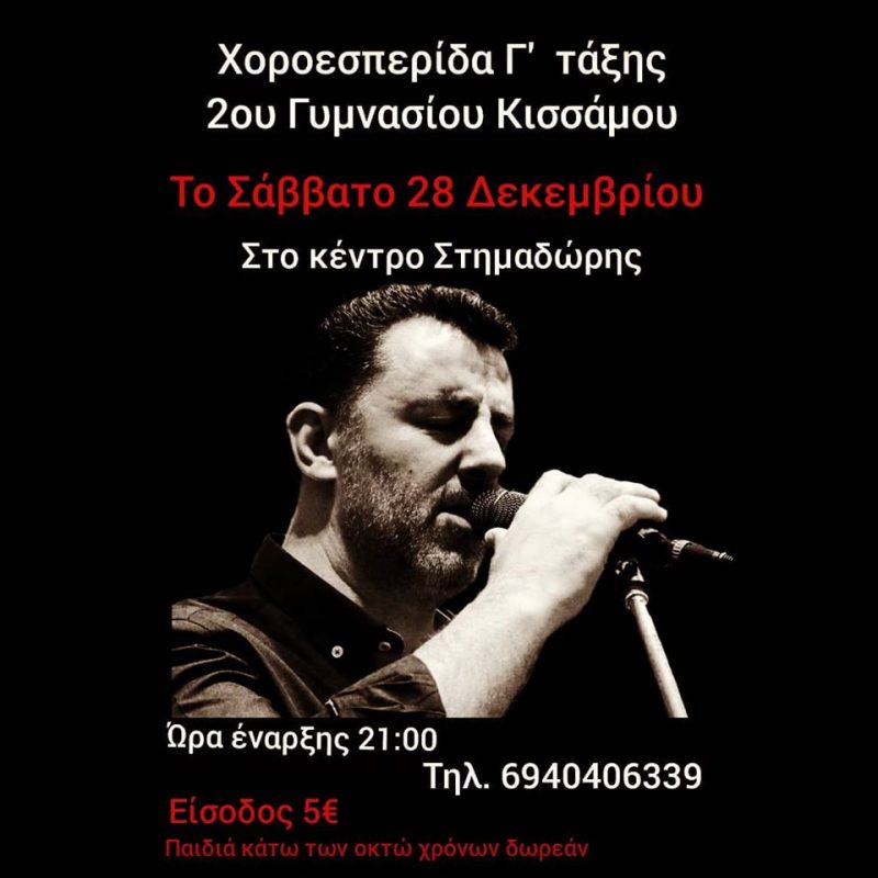 Το Σάββατο 28 Δεκεμβρίου, με ώρα έναρξης 9 μ.μ., θα πραγματοποιηθεί στο κέντρο “Στημαδώρης” στο Καστέλλι η χοροεσπερίδα της Γ’ Τάξης του 2ου Γυμνασίου Κισάμου. Θα σας διασκεδάσει ο Ηλίας Χορευτάκης με το συγκρότημα του.