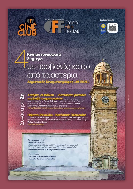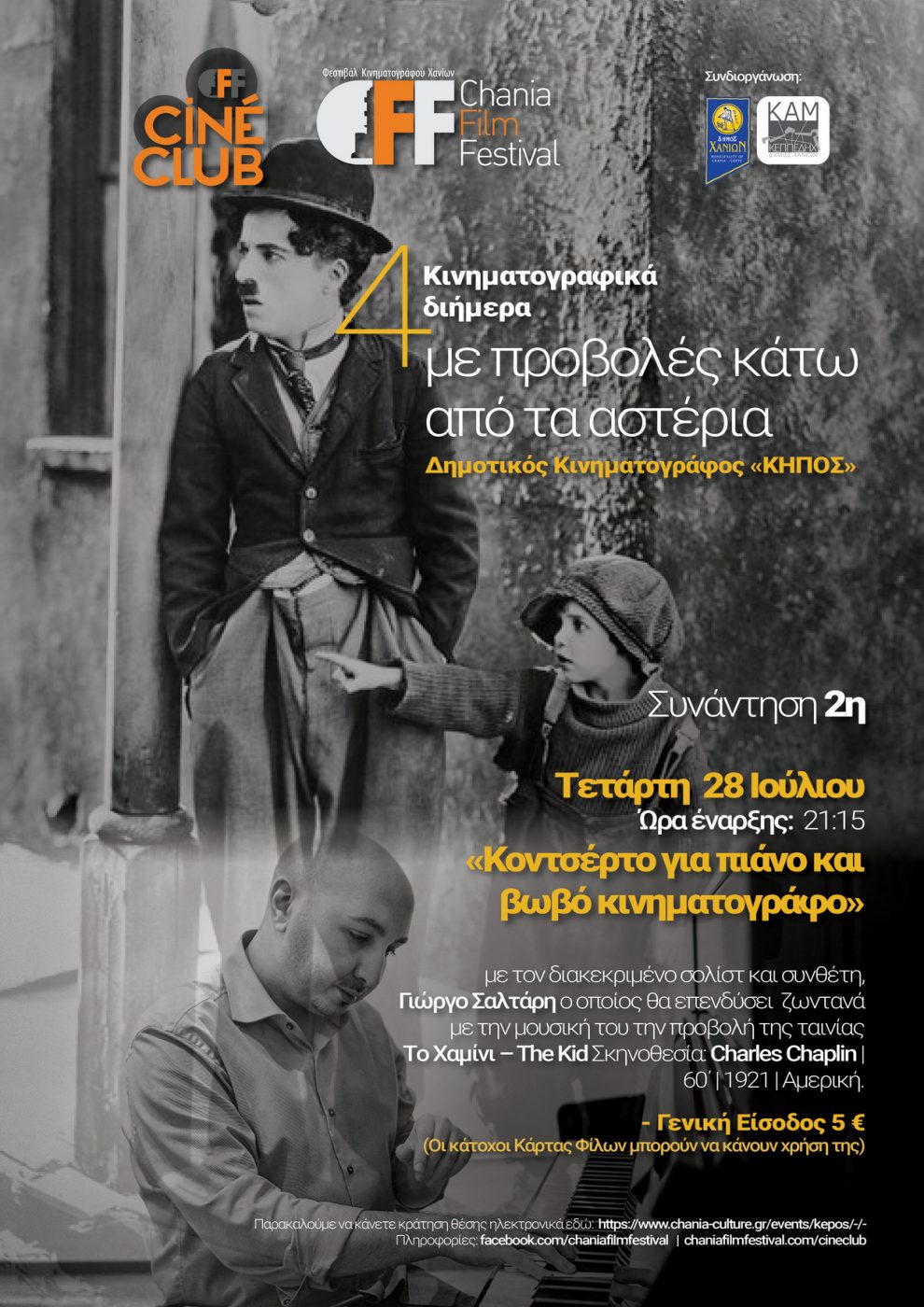 Τετάρτη 28 Ιουλίου:  Το Χαμίνι – The Kid προβολή – «Κοντσέρτο για πιάνο και βωβό κινηματογράφο» με τον διακεκριμένο σολίστ και συνθέτη, Γιώργο Σαλτάρη
