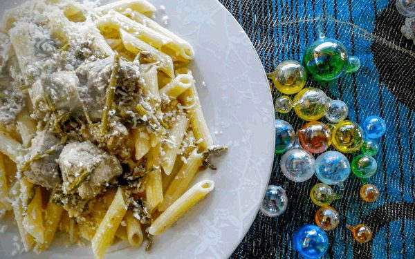 Χοιρινό με αγριοσπάραγγα και πέννες