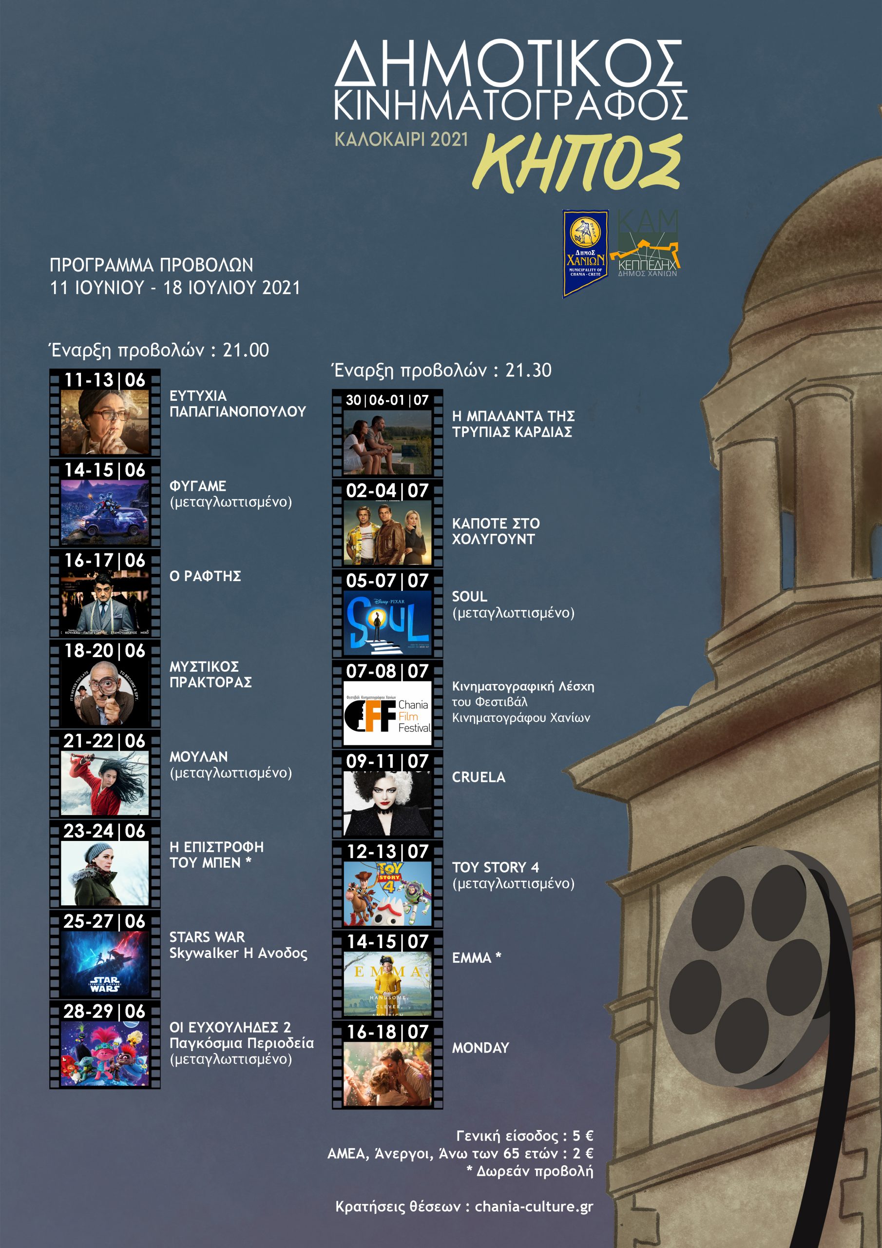 Ο Δήμος Χανίων και η Κ.Ε.Π.ΠΕ.ΔΗ.Χ. – Κ.Α.Μ. ανακοινώνουν το πρόγραμμα προβολών του Δημοτικού Κινηματογράφου Χανίων από σήμερα, Παρασκευή 11 Ιουνίου έως και την Κυριακή 18 Ιουλίου 2021.