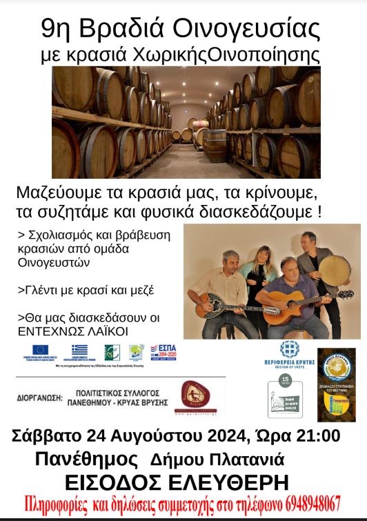 Ο Πολιτιστικός Σύλλογος Πανεθήμου – Κρύας Βρύσης και η Πολιτιστική Εταιρεία Κρήτης με την υποστήριξη της Περιφερειακής Ενότητας Χανίων και του Δήμου Πλατανιά διοργανώνουν την «9η Βραδιά Οινογευσίας με κρασιά Χωρικής Οινοποίησης» τo Σάββατο 24 Αυγούστου 2024 στην Πανέθημο του Δήμου Πλατανιά.