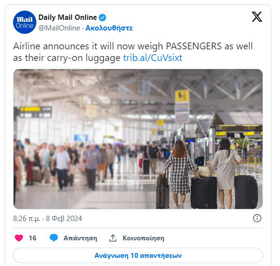 Mια αεροπορική εταιρεία ανακοίνωσε ότι θα αρχίσει να ζυγίζει τους επιβάτες μαζί με τις χειραποσκευές τους, προκειμένου να εκτιμήσει καλύτερα το βάρος του αεροπλάνου πριν από την απογείωση.