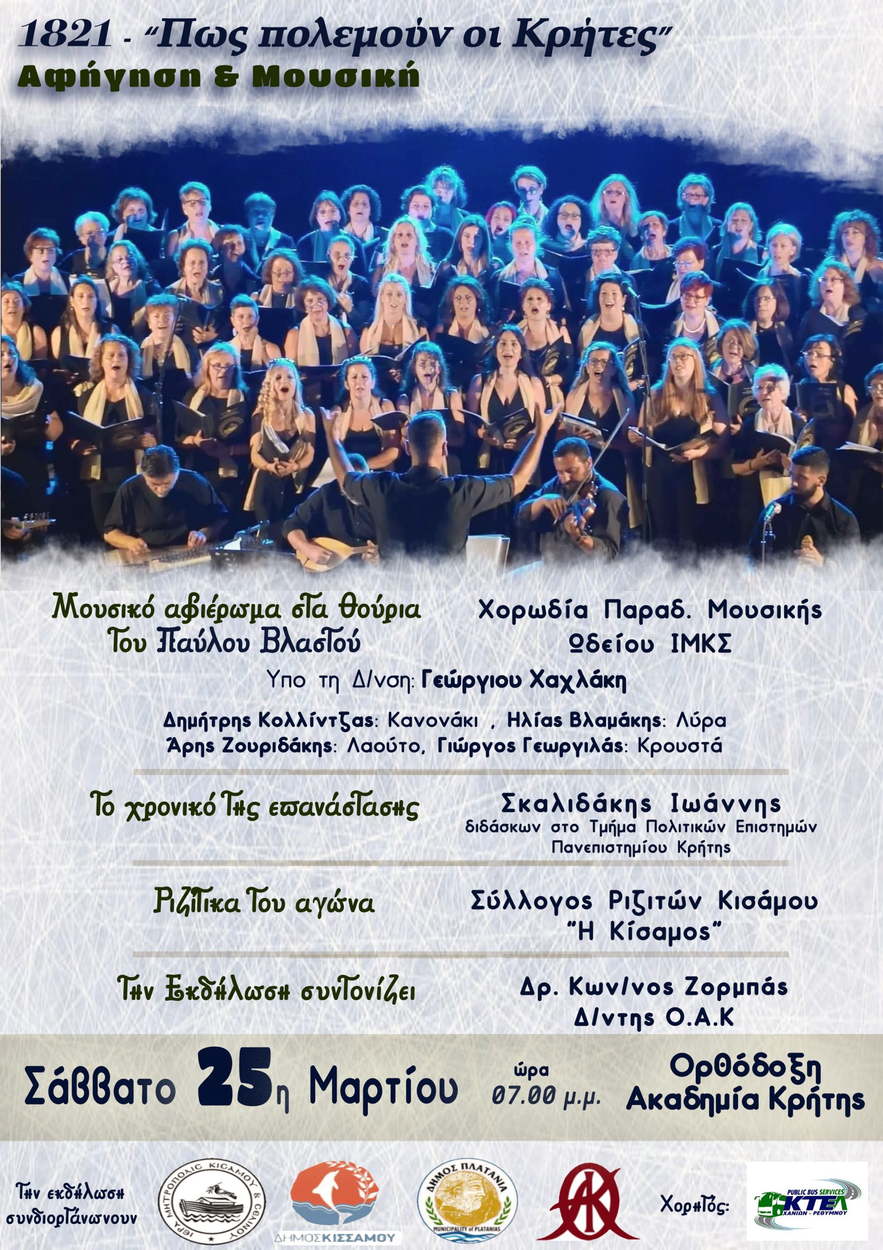 Ο διδάσκων στο Τμήμα Πολιτικών Επιστημών του Πανεπιστημίου Κρήτης και Ιστορικός κ.Σκαλιδάκης Ιωάννης θα παρουσιάσει το χρονικό των συγκρούσεων στην Κρήτη από 1821 έως και το 1830. Ο Σύλλογος Ριζιτών “Η Κίσαμος” θα αποδώσει Ριζίτικα της Επανάστασης. Η εκδήλωση θα διανθιστεί από την χορωδία της Παραδοσιακής Μουσικής του Ωδείου Ι. Μ. Κισάμου & Σελίνου, η οποία θα παρουσιάσει Θούρια από τη συλλογή του Παύλου Βλαστού, σπουδαίου Ιεροψάλτη και Λαογράφου. Την Χορωδία συνοδεύει τετραμελής ορχήστρας υπό την Δ/νση του Γεώργιου Χαχλάκη, ενώ εκτός του Μουσικού μέρους θα υπάρξει και σχετική Αφήγηση για το έργο. Συντονίζει ο Δρ. Κων/νος Ζορμπάς, Γεν. Δ/ντης της ΟΑΚ. Σας προσκαλούμε όλους να τιμήσουμε τους Κρήτες Αγωνιστές !