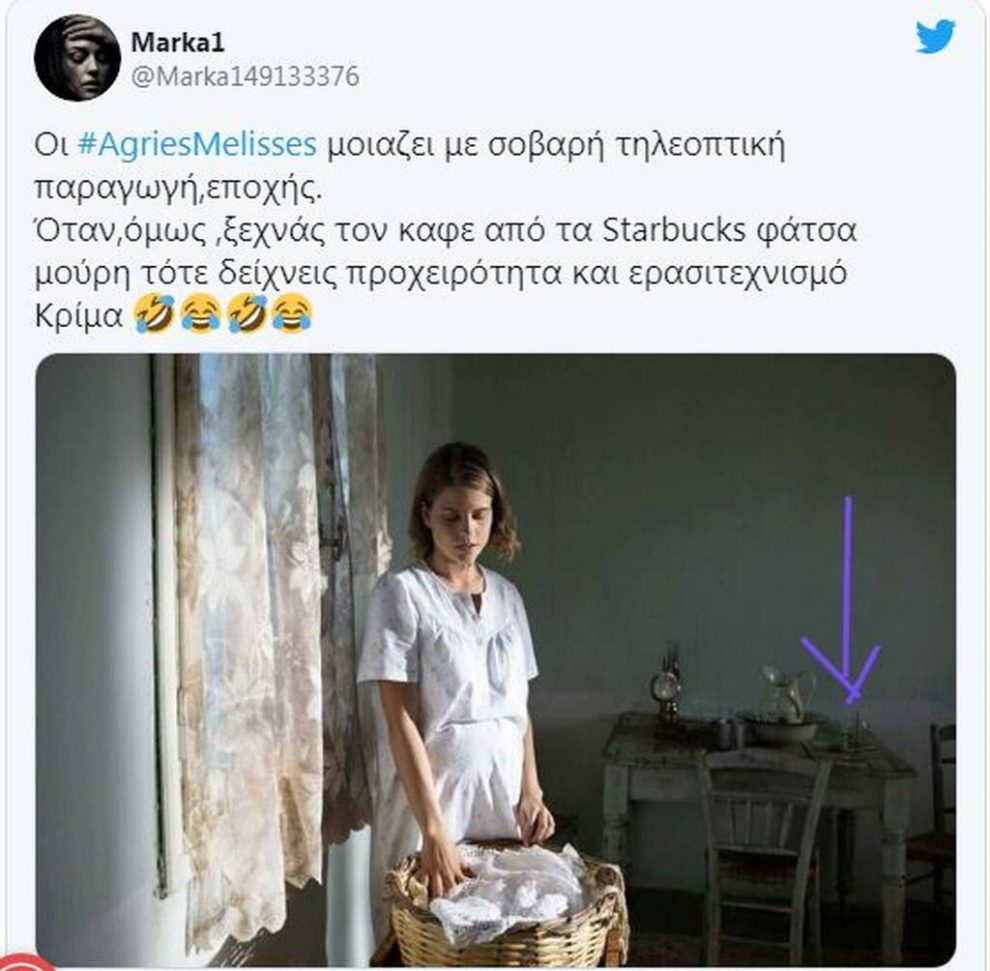 Χαμός έχει προκληθεί με τη φωτογραφία από επεισόδιο των «Άγριων Μελισσών» που έχει κυκλοφορήσει στο διαδίκτυο και στην οποία απαθανατίζεται η «Δρόσω» λίγες ώρες πριν γεννήσει, ενώ στο τραπέζι δίπλα της είναι ένα ποτήρι με φρέντο εσπρέσο γνωστής μάρκας καφέ και ένα κινητό.
