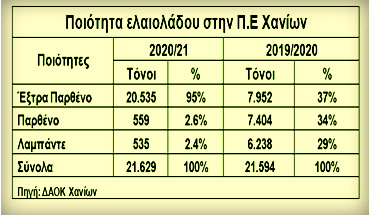 Σημαντικής σημασίας, πολύ μεγαλύτερης από όσο κάποιοι μπορεί να θεωρούν, ήταν η ανακοίνωση των ποιοτικών και ποσοτικών στοιχείων της φετινής και περσινής ελαιοπαραγωγής της ΠΕ Χανίων που δημοσιεύτηκαν στις 3-3-21 στα Χανιώτικα Νέα σε άρθρο του Γ. Κώνστα