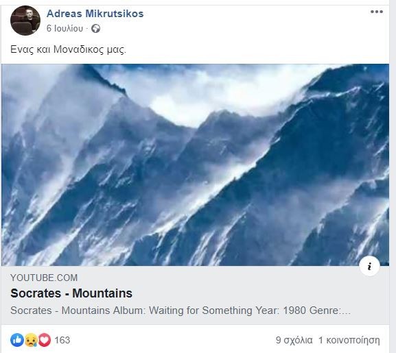 Ο ίδιος, αν και είχε εξαφανιστεί εδώ και καιρό από τα social media, έκανε πρόσφατα μια δημοσίευση που αναμένεται να συζητηθεί! Ο Ανδρέας Μικρούτσικος, ανέβασε στο προφίλ του στο Facebook το τραγούδι Mountains του καλλιτέχνη Socrates και έγραψε στην λεζάντα: «Ενας και Μοναδικος μας….».