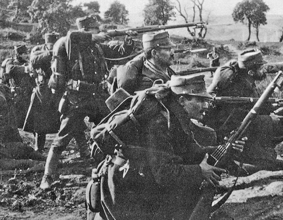 Έλληνες και Βούλγαροι Αξιωματικοί στην Άνω Τζουμαγιά καθορίζουν τη γραμμή . διαχωρισμού των στρατευμάτων μετά την προσωρινή ανακωχή (Από το . αρχείο του στρατηγού Γ. Σπυρίδωνος με ιδιόχειρη σημείωση του.)