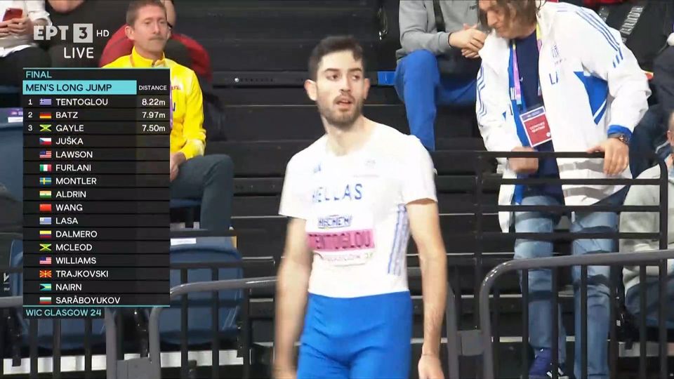 Ο Τεντόγλου, που πήγε στη Γλασκόβη με τη 2η καλύτερη επίδοση της διοργάνωσης (8.26), έστειλε μήνυμα από νωρίς στον τελικό, πηδώντας στα 8.22 μέτρα στο πρώτο του άλμα και κάνοντας βήμα για το βάθρο.