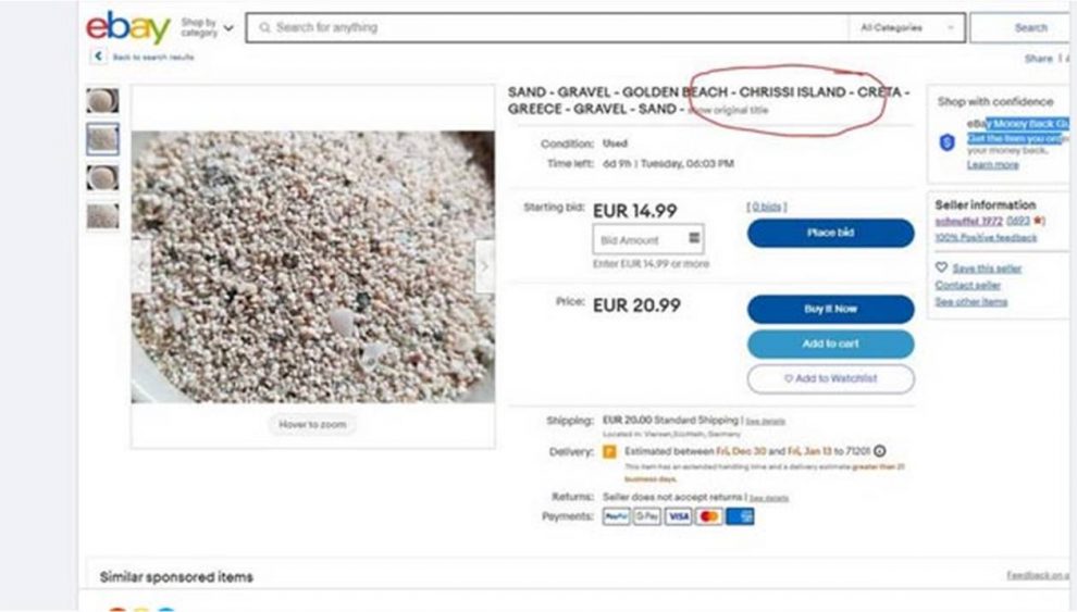 Πρόκειται για ένα θέμα το οποίο έρχεται να προκαλέσει μεγάλη εντύπωση, την ώρα που ολόκληρο σχέδιο του υπουργείου Περιβάλλοντος βρίσκεται σε εξέλιξη για την διάσωση της Νήσου. Ένα χρόνο τώρα κάτω από την «μύτη» των αρχών, επιτήδειοι βάζουν αγγελίες στην πλατφόρμα του ebay πωλώντας κυριολεκτικά «χρυσάφι» την άμμο της Νήσου Χρυσής. Πρόκειται για μία φοβερή καταγγελία που χρειάζεται διερεύνηση από τις Αρχές.