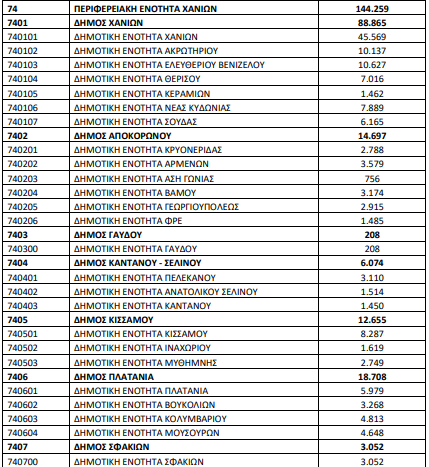 Αν Δήμο της Π.Ε. Χανίων ο πληθυσμός έχει ως εξής: