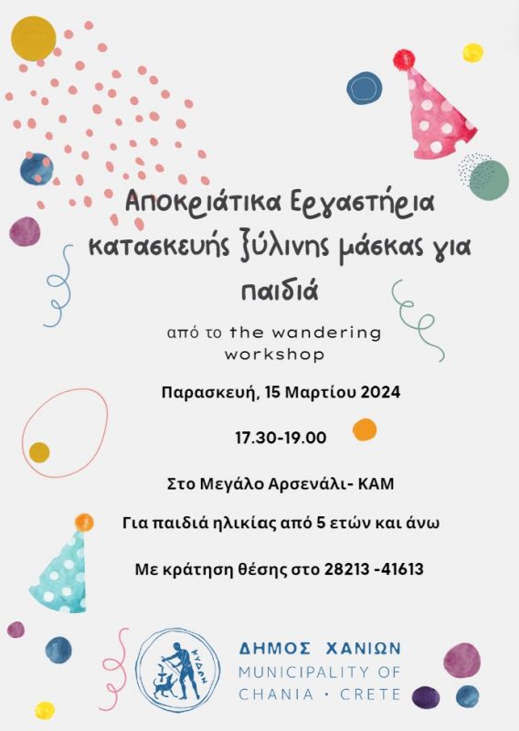 Η συμμετοχή στο εργαστήρι και τα υλικά είναι δωρεάν και αφορά παιδιά από 5 ετών και άνω. Απαραίτητη η προκράτηση θέσης στο 2821341613 – Γραφείο Πολιτισμού (εργάσιμες ημέρες και ώρες).