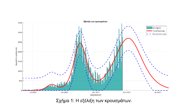Η κορύφωση του τρέχοντος κύματος θα επιτευχθεί στο αρχές του Απριλίου. Η σημαντική ελαχιστοποίηση των κρουσμάτων θα επέλθει τον Ιούλιο. Η ελαχιστοποίηση των κρουσμάτων νωρίτερα ή αργότερα από τον Ιούλιο θα εξαρτηθεί από την πορεία των εμβολιασμών, από την τήρηση των στοιχειωδών μέτρων έως ότου ολοκληρωθούν οι εμβολιασμοί. Η τήρηση των αποστάσεων, η αποφυγή συνωστισμών και η σωστή χρήση της μάσκας θα είναι οι σημαντικοί παράγοντες μετά την άρση του απαγορευτικού ώστε να ελαχιστοποιηθούν τα κρούσματα και να μην εμφανιστεί αργότερα άλλο κύμα.