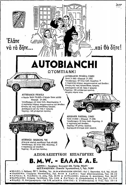 Όταν ακούμε το όνομα Autobianchi, το μυαλό όλων πάει αυτομάτως στο θρυλικό μικρό A112. Παρόλα αυτά η ιστορία της ξεκινάει πολύ νωρίτερα. H Autobianchi ιδρύθηκε τον Ιανουάριο του 1955 με μετόχους την εταιρία κατασκευής ποδηλάτων Bianchi, την Pirelli και τη Fiat. Είναι άγνωστο πότε ξεκίνησε η παρουσία της στην ελληνική αγορά, πάντως τα αυτοκίνητα της εισάγονταν ήδη τη δεκαετία του ’60. Ο παλιότερος γνωστός εισαγωγέας, σύμφωνα με την έρευνα, είναι η «ΜΟΤΟΡΕΛ Ε.Π.Ε» επί της Λ. Συγγρού 74.