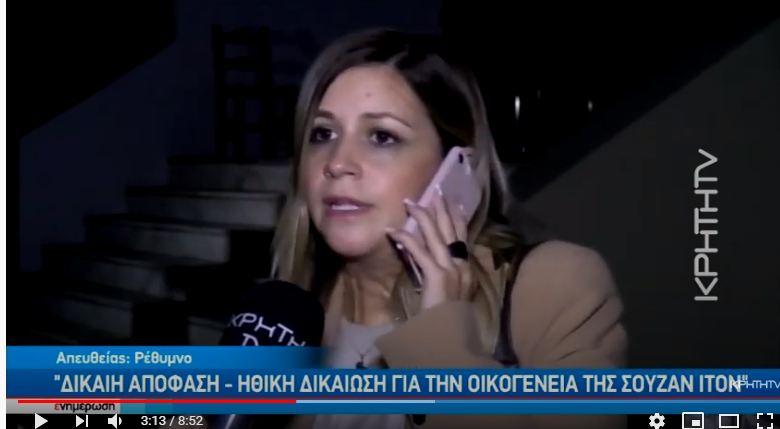 «Παρόλο αυτά οφείλω να πω ότι είχαμε μίας εξαιρετικής ποιότητας δικαστική διαδικασία, εξαιρετικής ποιότητας δικαστές. Η οικογένεια από την πρώτη στιγμή είχε απόλυτη εμπιστοσύνη στην κρίση της Ελληνικής Δικαιοσύνης και από την πρώτη στιγμή μας ζητήθηκε, τόσο εμένα, όσο και από τους συναδέλφους μου να δώσουμε ένα μήνυμα προς όλους τους Κρητικούς, που τους ευχαριστούν πάρα πολύ από τον πιο απλό βοσκό μέχρι τον εξαιρετικά ταλαντούχο επιστήμονα, που ζούσε εκείνη την περίοδο στα Χανιά. Βοήθησαν όλοι στην ανεύρεση του πτώματος της άτυχης Σούζαν Ίτον. Όλοι οι Χανιώτες “αγκάλιασαν” την οικογένεια, έκαναν ότι μπορούσαν για να διαλευκανθεί αυτή η υπόθεση».