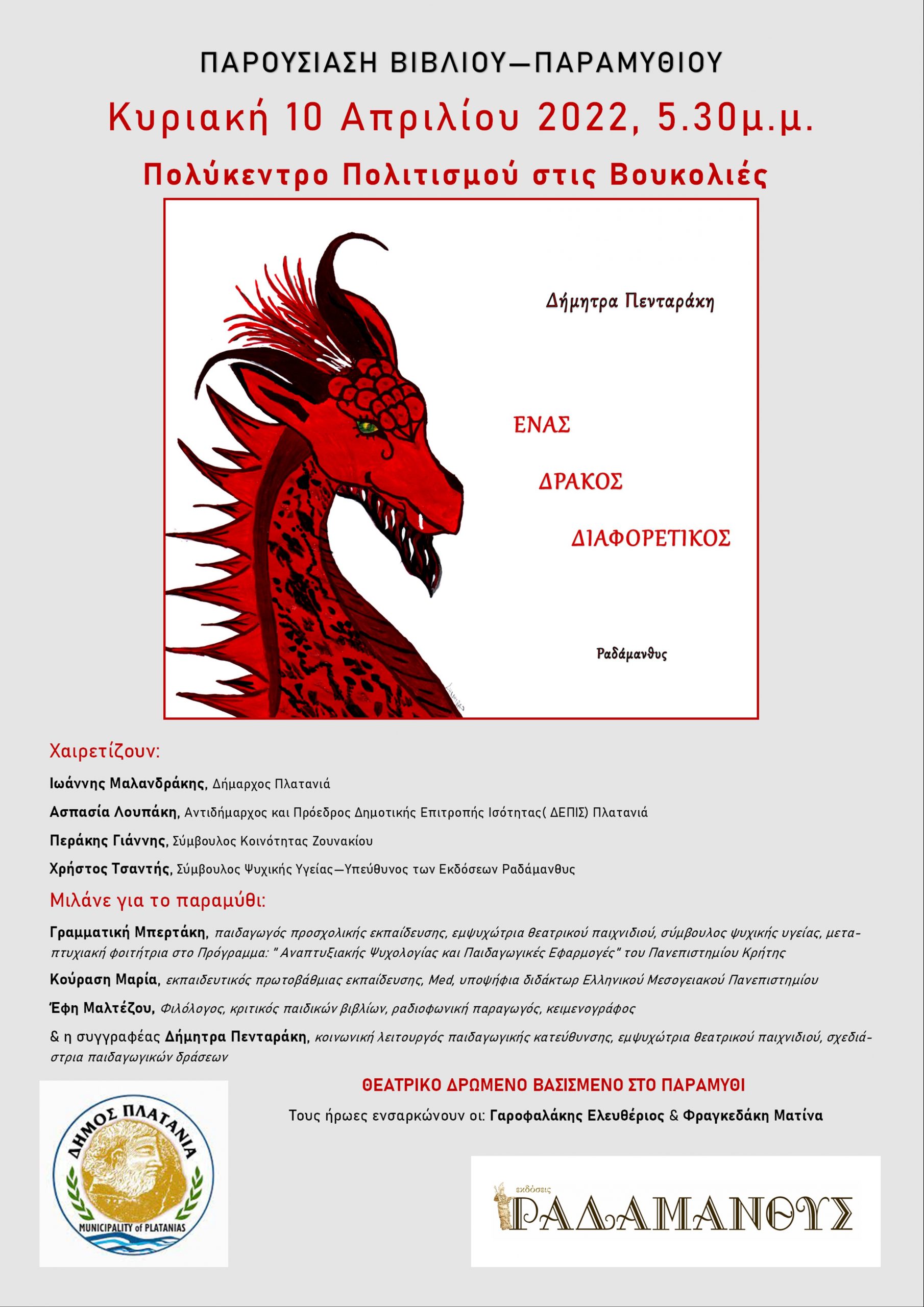 Ο Δήμος Πλατανιά σε συνεργασία με τις Εκδόσεις Ραδάμανθυς, παρουσιάζουν το παιδαγωγικό παραμύθι της Δήμητρας Πενταράκη, «Ένας Δράκος Διαφορετικός», την Κυριακή 10 Απριλίου, στις 5:30 το απόγευμα στο Πολύκεντρο Βουκολιών του Δήμου Πλατανιά.