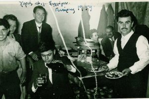 Πρωτοχρονιάτικος χορός Φιλολογικού Συλλόγου Κισάμου (1959). Από αριστερά: Γεράσιμος Σκαράκης, Φιλένια Πατεράκη, Λευτέρης Παπαδάκης, Ανδρέας Ξηρουχάκης, Γιάννης...