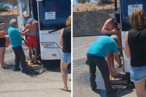 Έκπληξη και εντύπωση προκάλεσε στους επισκέπτες των Χανίων η στιγμή που ένας οδηγός λεωφορείου πήρε την πρωτοβουλία να πλύνει τα πόδια τους με λάστιχο πριν...