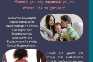 Το Κέντρο Κοινότητας Δήμου Κισάμου σε συνεργασία με το Κέντρο Πρόληψης Π.Ε. Χανίων διοργανώνουν ενημερωτική συνάντηση με θέμα: «Γονείς μου σας παρακαλώ μην μου...