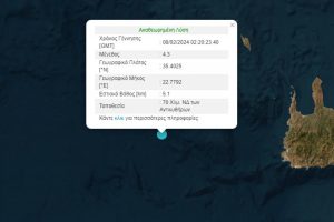 Σεισμική δόνηση μεγέθους 4,3 βαθμών της κλίμακας Ρίχτερ, σύμφωνα με την αναθεωρημένη λύση του Ευρωπαϊκού – Μεσογειακού Σεισμολογικού Κέντρου (EMSC)...