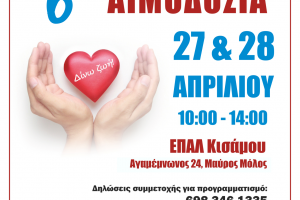 Την Πέμπτη 27 και Παρασκευή 28 Απριλίου και ώρες από 10 π.μ. έως 2 μ.μ. ο Σύλλογος Αιμοδοτών/ Διδασκόντων ΕΠΑΛ Κισάμου «Μητροπολίτης Ειρηναίος Γαλανάκης»...
