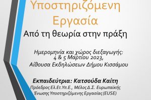 Το Ε.Ε.Ε.ΕΚ. Κισάμου, σε συνεργασία με την Ελληνική Εταιρία Υποστηριζόμενης Εργασίας (ΕΛ.ΕΤ.ΥΠ.Ε.) και το Δήμο Κισάμου, διοργανώνουν διημερίδα εκπαίδευσης στην...