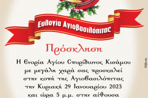 Η Ενορία Αγίου Σπυρίδωνος Καστελλίου, σας προσκαλεί στην κοπή της Αγιοβασιλόπιτας την Κυριακή 29 Ιανουαρίου και ώρα 5 μ.μ. στην αίθουσα του Αγίου Σπυρίδωνος...