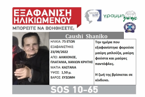 Νέα εξαφάνιση απασχολεί τις αστυνομικές αρχές της Κρήτης. Αυτή τη φορά δηλώθηκε εξαφάνιση ηλικιωμένης από τον Πλατανιά. Η Caushi Shaniko, 75 ετών, εξαφανίστηκε...