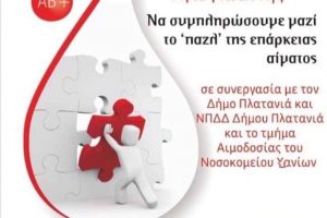 Ο Δήμος Πλατανιά, το ΝΠΔΔ Δήμου Πλατανιά, ο Σύλλογος Εθελοντών Αιμοδοτών Νομού Χανίων, ο “Άγιος Ιωάννης” και το Τμήμα Αιμοδοσίας του Γ. Νοσοκομείου Χανίων ο...