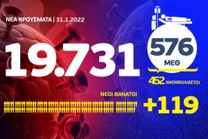 Σε 19.584 ανέρχονται τα νέα κρούσματα κορωνοϊού στη χώρα, το τελευταίο 24ωρο, σύμφωνα με την ενημέρωση του ΕΟΔΥ, το απόγευμα του Σαββάτου 29 Ιανουαρίου 2022...