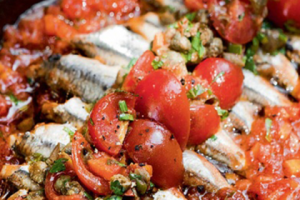 Υλικά: 1 κιλό γαύρο, 2 µεγάλες ώριµες ντοµάτες, 2 σκελίδες σκόρδο, 1 κουταλιά ρίγανη, 1 φλιτζάνι ελαιόλαδο, χυµό από 1 λεµόνι µικρό, αλάτι. Εκτέλεση: Πλένουµε...