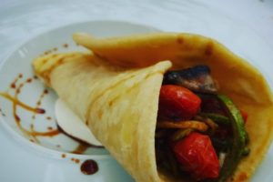 Υλικά: Μερικές φέτες από μελιτζάνες, κολοκύθια, πιπεριές χρωματιστές, ντομάτες, μαϊντανό, λίγο έξτρα παρθένο ελαιόλαδο, ανθό του αλατιού. Υλικά για τις πίτες...