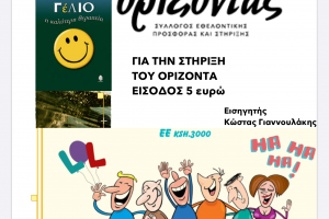 “Γιόγκα Γέλιου” από τον Κώστα Γιαννουλάκη για την οικονομική στήριξη του Συλλόγου “Ορίζοντας”. Πέμπτη 1 Φεβρουαρίου 2024 στις 19:00...