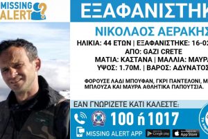 Άφαντος παραμένει ο 44χρονος Νίκος Αεράκης, τα ίχνη του οποίου αγνοούνται από την Πέμπτη 16 Φεβρουαρίου, από την περιοχή του Γαζίου, στο Ηράκλειο. Σήμερα...